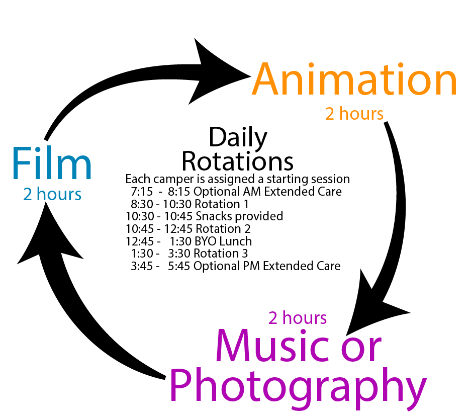 • Each day campers rotate through 3 sessions: Film, Animation, Music + Photography (more details below)